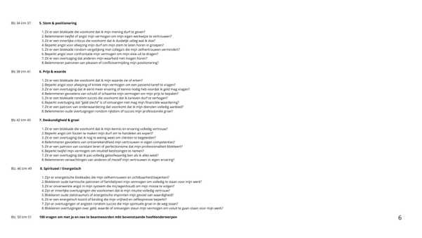 - Diepgaande blokkadevragen: Je krijgt 64 kernvragen verdeeld over alle essentiële lagen: fysiek, emotioneel, mentaal, eigen waarde, stem & positionering, prijs & waarde, deskundigheid & groei en spiritueel/energetisch.